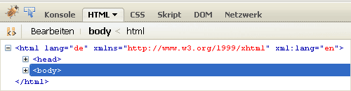 Der Menüpunkt "HTML" wird gewöhnlich automatisch aktiviert. Auch sucht sich Firebug direkt das <body>-Element